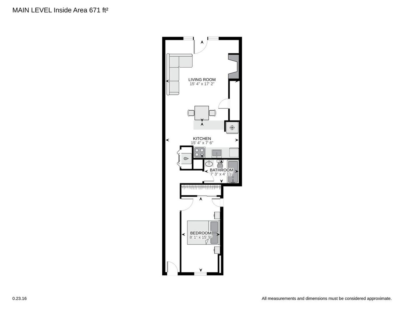 - 1BR/1BA, approx. 680 sq. ft.